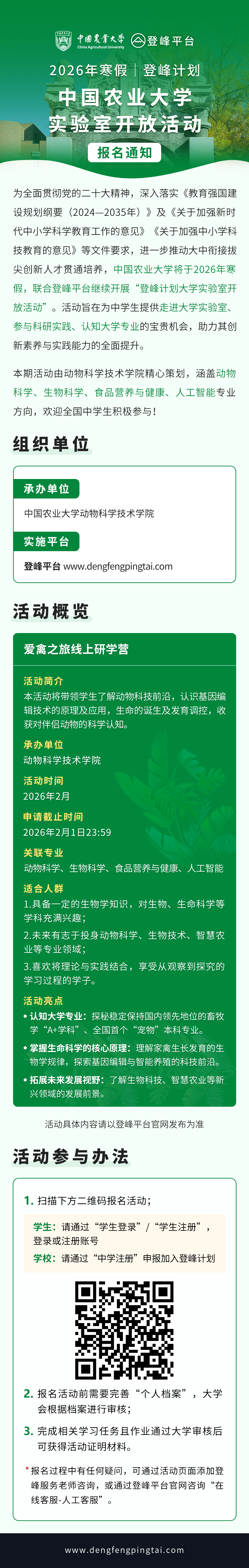 中國農(nóng)業(yè)大學2026年寒假登峰計劃大學實驗室開放活動報名通知發(fā)布,本期活動涵蓋動物科學、生物科學、食品營養(yǎng)與健康、人工智能專業(yè)方向,歡迎全國中學生積極參與!